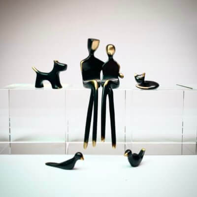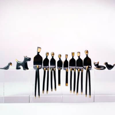 The sculptures are created using traditional lost wax casting. Only the highest fine art quality bronze is used. The figures are individually finished in either classic black patina with polished highlights, brushed bronze, or silver-plated bronze.