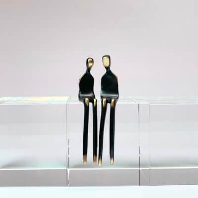 The statues come in miniature size for the shelf, in table top size, or in various sizes for larger spaces or the sculpture garden. For example, the measurement of the small figures from head to toe without the base is 4.5” for the figures (Caress, The Two of Us). The regular small base measures approx. 4 x 3 x 2″. Horizontal or vertical placement depends on the figures chosen.