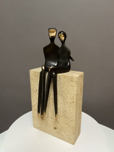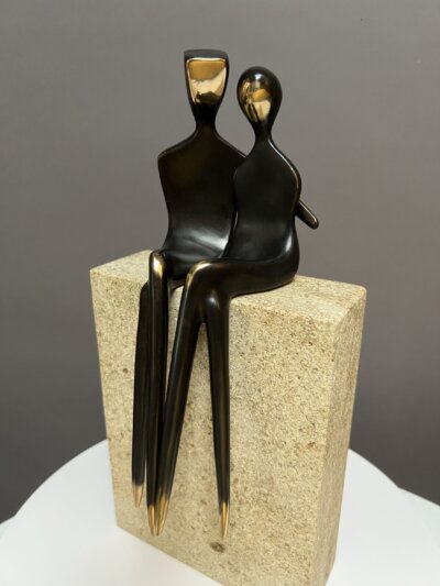 The statues come in miniature size for the shelf, in table top size, or in various sizes for larger spaces or the sculpture garden. For example, the measurement of the small figures from head to toe without the base is 4.5” for the figures (Caress, The Two of Us). The regular small base measures approx. 4 x 3 x 2″. Horizontal or vertical placement depends on the figures chosen.