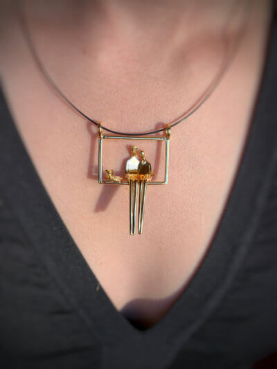 This art jewelry pendant features the Close to Me couple as a swing pendant with your favorite furry friend. The gold-plated sterling silver pendant is finely crafted and finished. The original Close to Me sculpture is a 20″ sculpture that was reduced to the wearable jewelry size for everyone to cherish, enjoy and gift to a loved one.