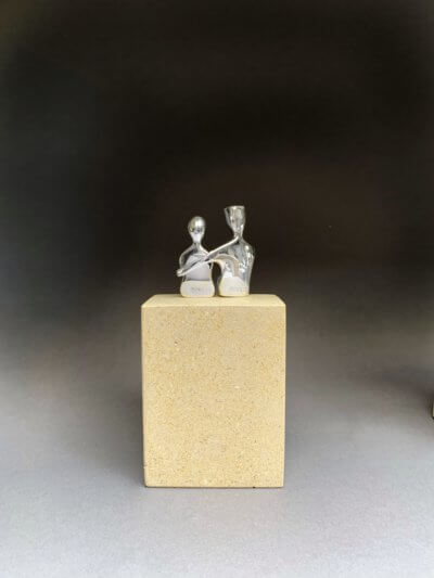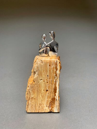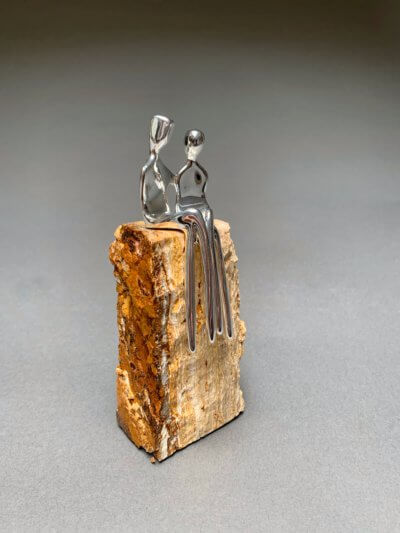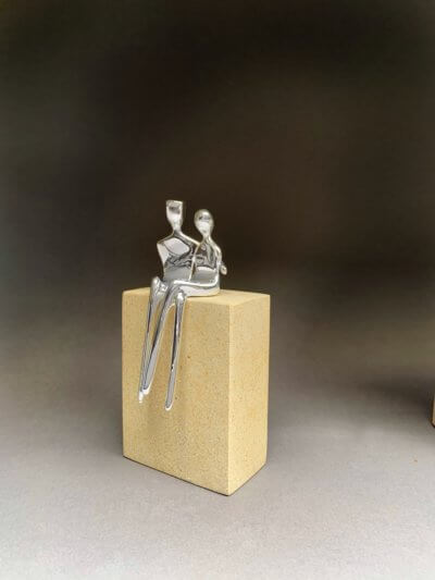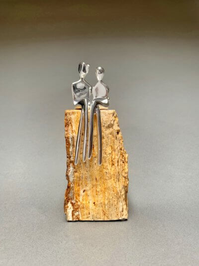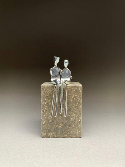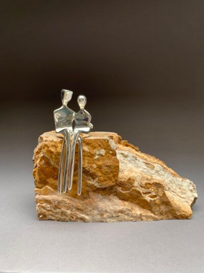 My favorite, best-selling bronze pair is “Caress”. He has his caressing arm around her as they nest together lovingly on their natural stone seat. These are the parent figurines to many of the families, and child figurines can be added.