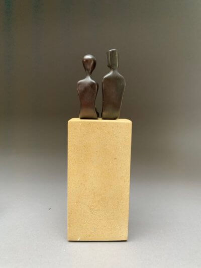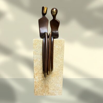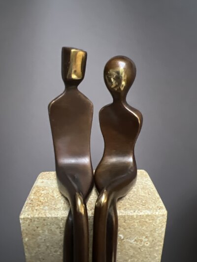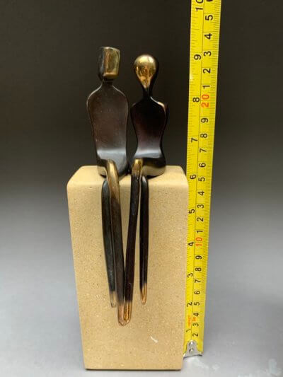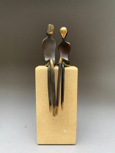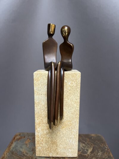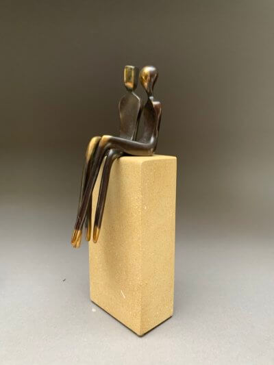 Elegant Couple Dark Patina 6.5″ on Limestone, this slender, elegant bronze sculpture of a seated couple. The figures measure 6.5 inch from head to toe. The base is 6″ tall. the total height including base is 9″ Please inquire about mounting options.