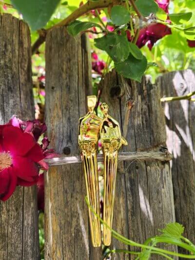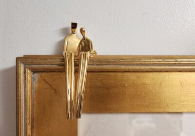 Gold-plated collectible figures without stone, these are “good” seconds with some minor scratches and irregularities not visible to the untrained eye. The black marble base is not included but can be purchased separately if desired. The figures are seated neatly on a shelf or ledge. A picture frame makes a great seat as well.
