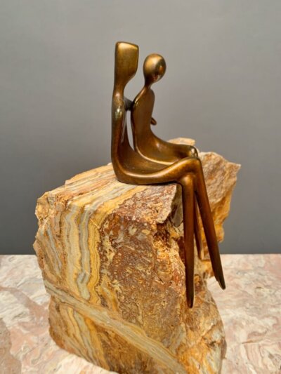 The Lovers in 8.5″ are mounted on a very interesting travertine stone base. The base has lots of character and the earth and rust tones of the travertine are mirrored in the figures luster and patina. The total height with figures and base is 12″. It’s 8″ wide and 7 deep.