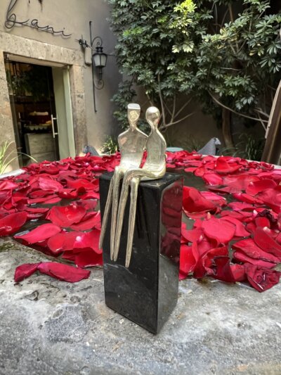 The statues come in miniature size for the shelf, in table top size, or in various sizes for larger spaces or the sculpture garden. For example, the measurement of the small figures from head to toe without the base is 4.5” for the figures (Caress, The Two of Us). The regular small base measures approx. 4 x 3 x 2″. Horizontal or vertical placement depends on the figures chosen.