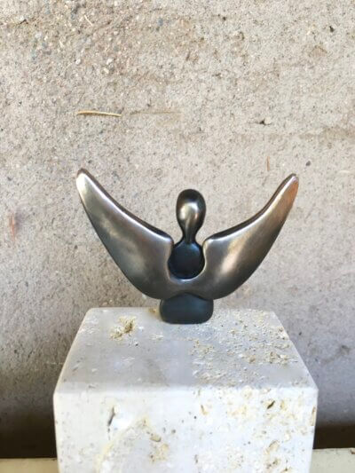 Angel figurine in solid bronze. (also available without a base) My angel is a collectible modern, angelic sculpture. She can be seated on a shelf, the mantle or on a custom stone base. Here pictured mounted on unique travertine base. The bronze angel represents hope, devotion, trust and faith. Your angel may watch over your family as a protector through each day and night, or may be sent to guide home a loved one who has recently passed. The angel can sit atop a shelf, even the computer monitor or TV screen can be a seat for her, attached with a glue dot or museum putty.