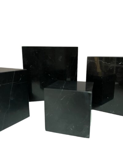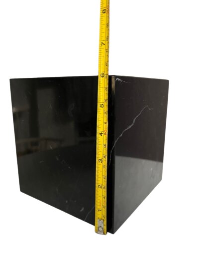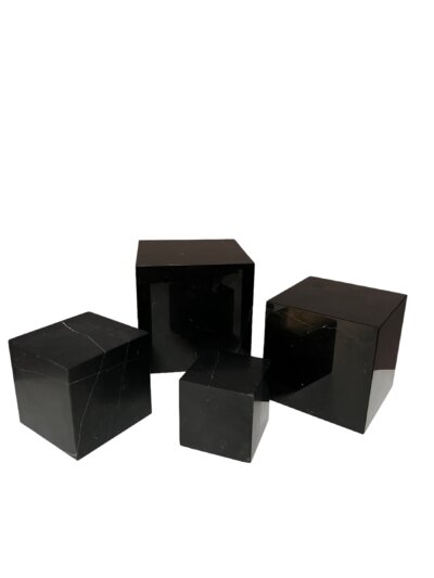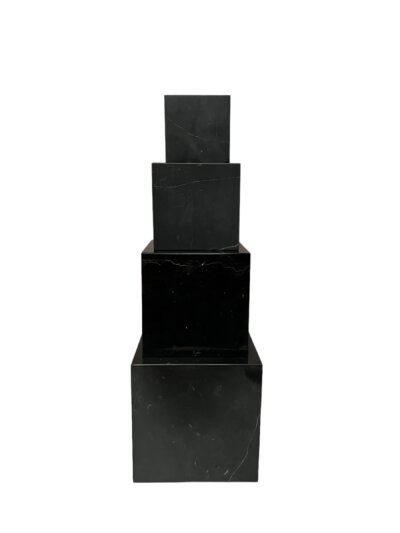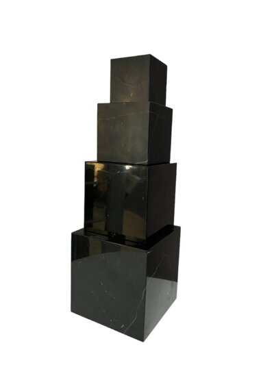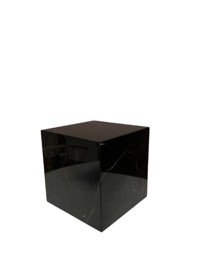 Nero Marquina cube sculpture base. It is a beautiful black marble plinth, sometimes with veins sometimes more black. This contemporary, modern, marble sculpture base is available in many sizes. Please select from the drop down menu. Indicate if you want to have visible veins or more black coloration. Round, rectangular, square and oval sizes are also available.