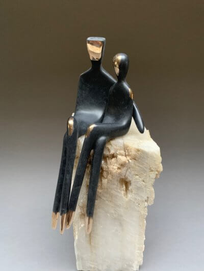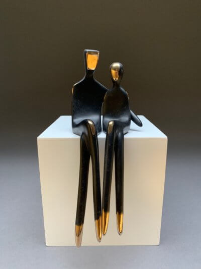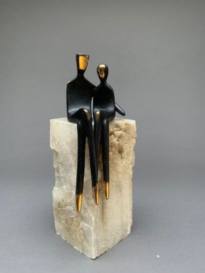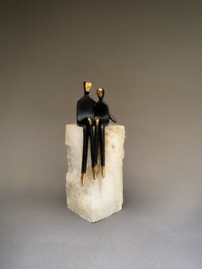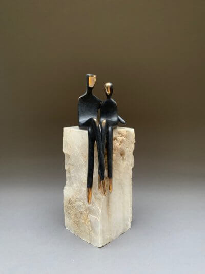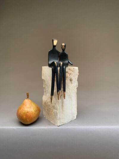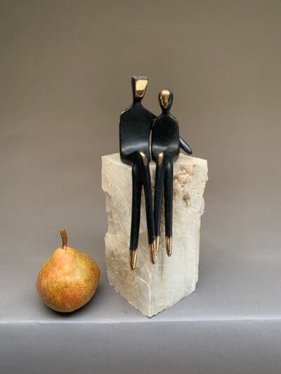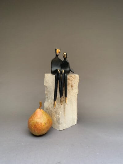 The statues come in miniature size for the shelf, in table top size, or in various sizes for larger spaces or the sculpture garden. For example, the measurement of the small figures from head to toe without the base is 4.5” for the figures (Caress, The Two of Us). The regular small base measures approx. 4 x 3 x 2″. Horizontal or vertical placement depends on the figures chosen.