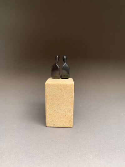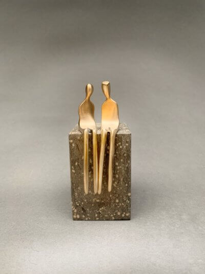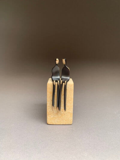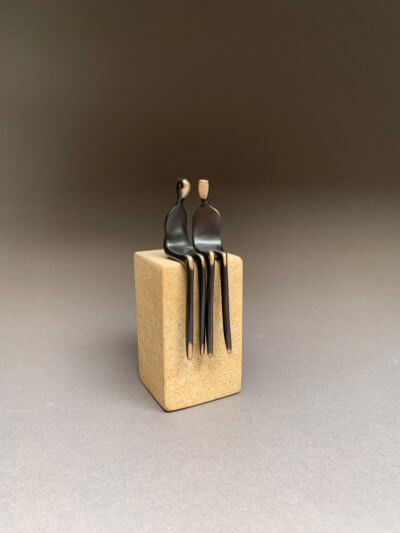 These Soulmates 3.75″ bronze figurines with straight legs are smaller and whimsical. They are playfully seated together as if in conversation with one another. Without additional figures, they are a smaller couple. Or they can be the kids to the larger parents pair like “The Two of Us” or “Caress”.