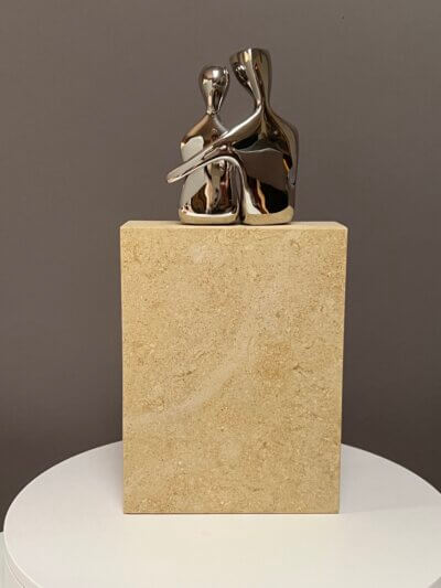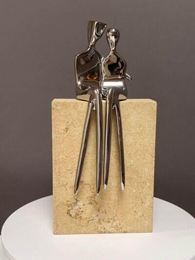 The statues come in miniature size for the shelf, in table top size, or in various sizes for larger spaces or the sculpture garden. For example, the measurement of the small figures from head to toe without the base is 4.5” for the figures (Caress, The Two of Us). The regular small base measures approx. 4 x 3 x 2″. Horizontal or vertical placement depends on the figures chosen.