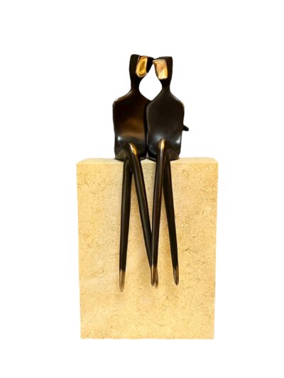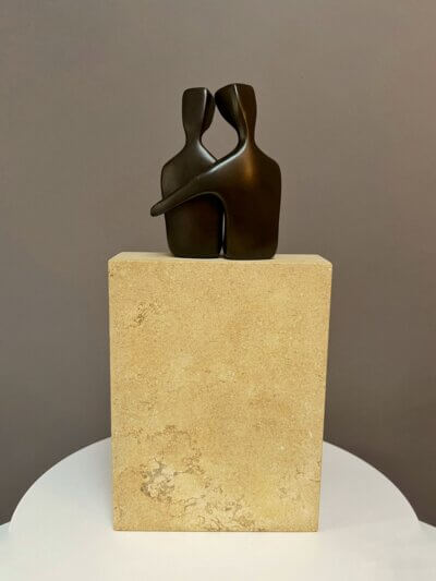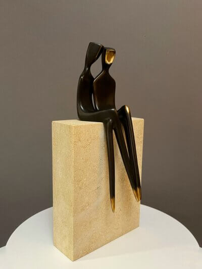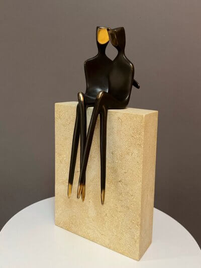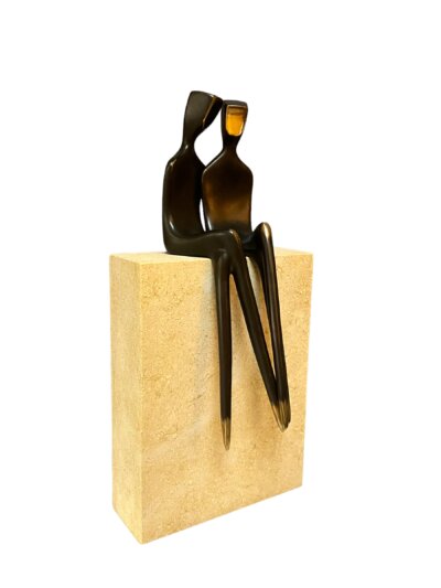 Two Grooms, 10″ modern bronze sculpture, depicting two men in love. This table-top size statue is a set of two. Cast silicone bronze with traditional dark patina. Mounted or unmounted on a natural stone base. “ Two Grooms” is part of my collectors in the 4.5″ size. My gay collectors frequently asked me to make them larger.  I worked on this 10″ version last year. If you are searching for lesbian women sculpture, please look through my listings. I have two women sculptures in 4.5″ and 10″. I even have them as a pendant. A sculpture to wear.