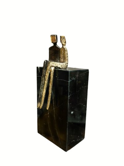 Two Guys in Love Bronze Figures 5″ from head to toe original bronze figures depicting a couple. Gay couple sculpture in real cast bronze on a black marble base. Gay anniversary gift to the sophisticated fine art collecting couple. One figure is black with highlights, the other polished bronze. The original bronze castings are from a stock of Yenny’s works from her studio.