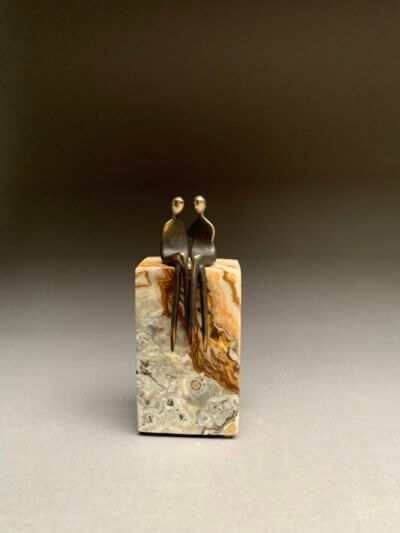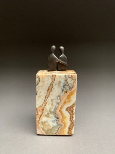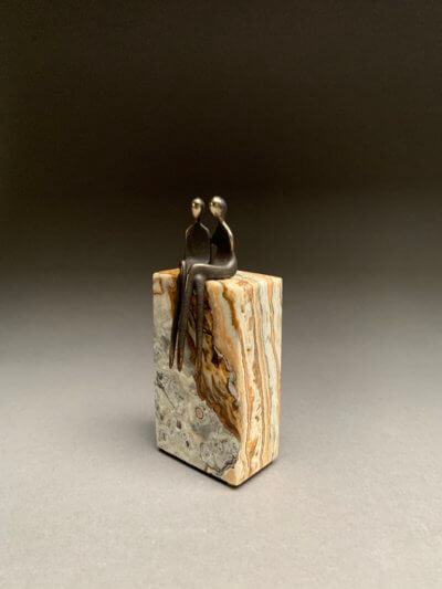 The statues come in miniature size for the shelf, in table top size, or in various sizes for larger spaces or the sculpture garden. For example, the measurement of the small figures from head to toe without the base is 4.5” for the figures (Caress, The Two of Us). The regular small base measures approx. 4 x 3 x 2″. Horizontal or vertical placement depends on the figures chosen.